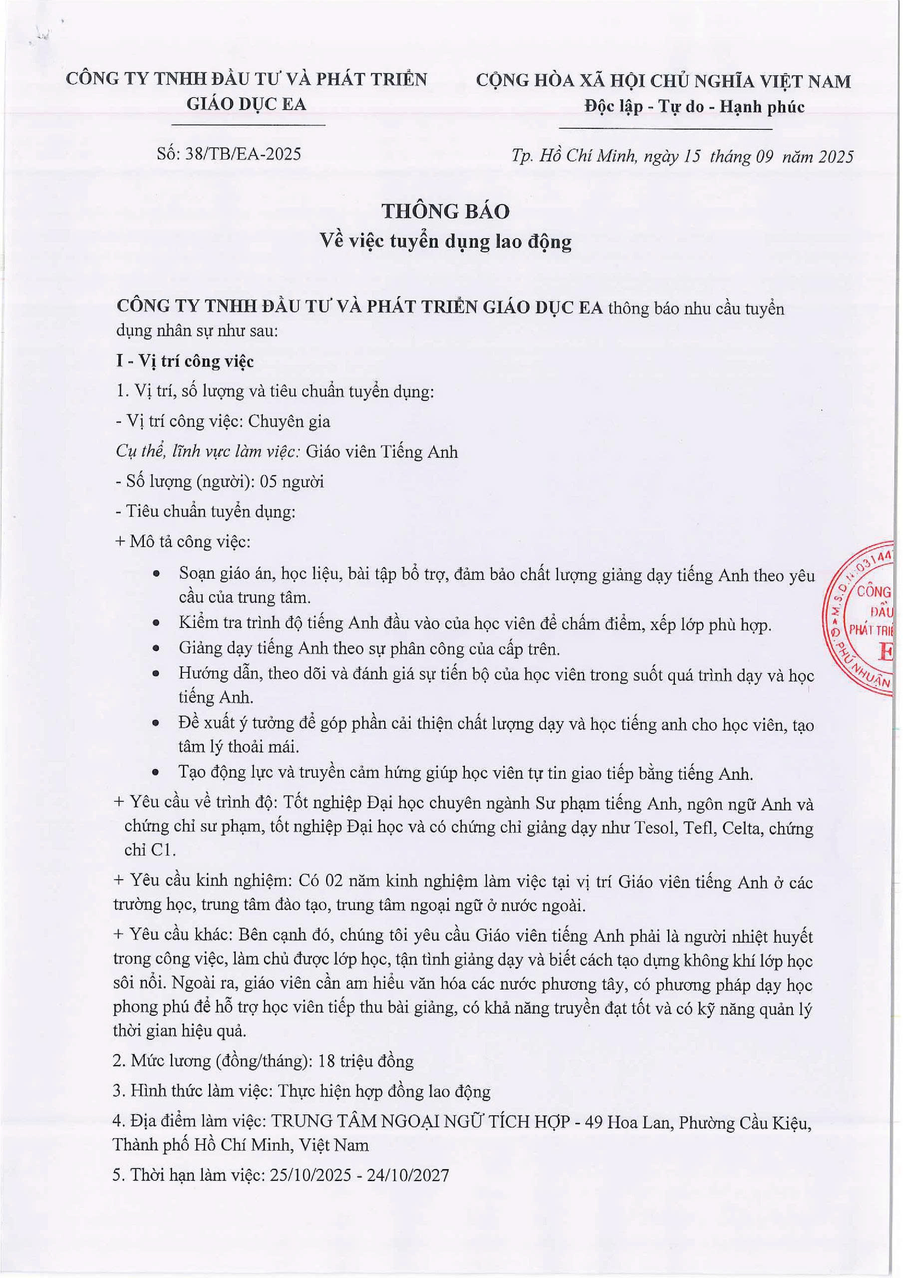 - Địa điểm làm việc: TRUNG TÂM NGOẠI NGỮ TÍCH HỢP EA – 49 Hoa Lan, Phường Cầu Kiệu, TP. Hồ Chí Minh, Việt Nam
